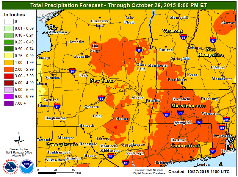 From National Weather Service.[/caption]The National Weather Service warns that a "potentially powerful storm working across the northern Great Lakes could bring strong winds to mainly the elevated terrain on Wednesday [Oct. 28] into Wednesday night....Also, this storm looks to bring a soaking rainfall to the entire region." Up to three inches of rain could fall on parts of the region, especially the Catskills.