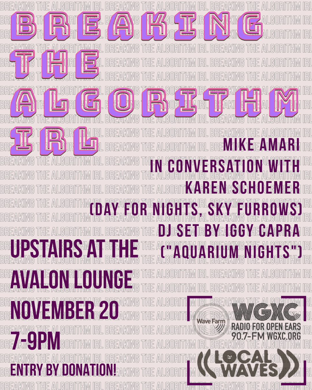 Turn out on Thursday, November 20th at 7pm Upstairs at the Avalon Lounge for the next edition of “Breaking the Algorithm IRL,” a monthly series presented by Wave Farm’s WGXC 90.7-FM as part of our Loc...