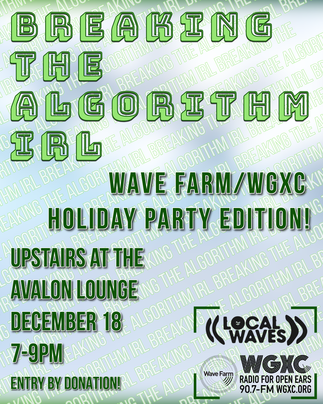 Turn out on Thursday, December 18th at 7pm Upstairs at the Avalon Lounge for the next edition of “Breaking the Algorithm IRL"! This month is the Wave Farm/WGXC holiday party, so join us to hear from W...